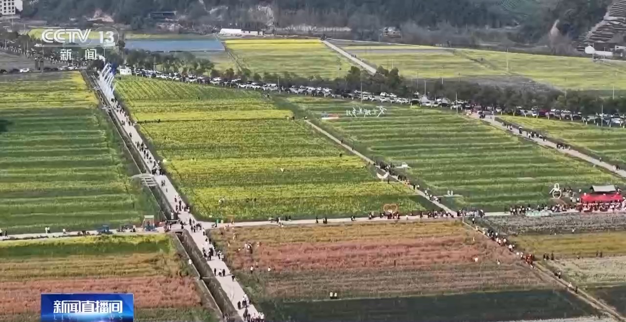 走进浙江金华市武义县大田乡白衣坑村,500亩七彩油菜花进入盛放期,与远处茶山相映成趣。观光小火车穿行花海,游客徜徉其间,尽享春日风光。